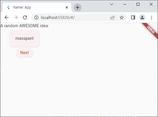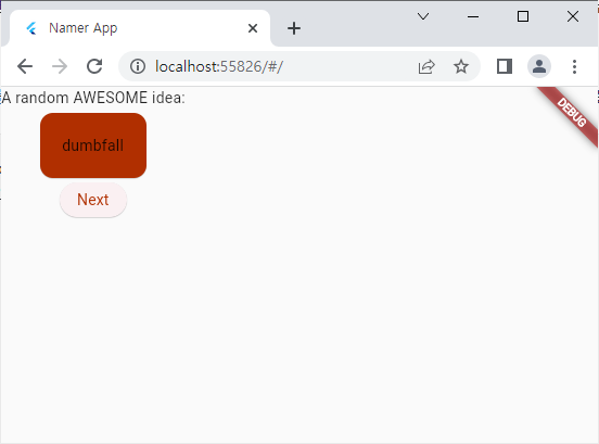 이렇게 하고 나면, Text Widget이 BigCard라는 클래스로 변경되고, 코드 가장 아래쪽에 BigCard라는 클래스가 추가 됩니다. BigCard가 원래 제공되는 클래스인지 정확히 모르겠네요. build 함수의 리턴값으로 Text Widget을 넘겨주고 있으니 아마도 그대로 실행해도 똑같이 될 것 같은데, 멤버로 WordPair가 있는 것을 보면 원래부터 있는 것 같기도 하고... 저장을 하고(Hot reload가 되고) 보니 이전처럼 보이는 것으로 봐서 기존의 Widget을 리턴 해 주되 다른 처리를 할 수 있는 형태로 변경하는 과정인 것 같습니다. 아직은 배경 지식이 부족하니 너무 고민하지 말고 일단 한번 따라가 보는데 의의를 두고 진행 해 보겠습니다.