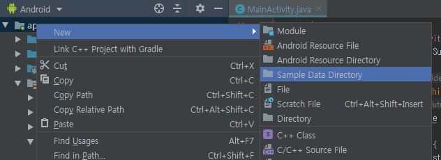 다운로드 받은 데이터를 프로젝트에 추가 시키기 위해 android studio에서 데이터 폴더 만들기를 했더니 만들어지지 않는군요.