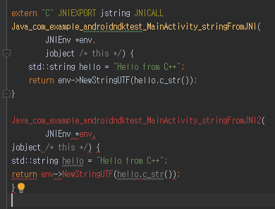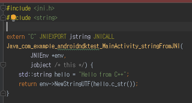 이 문자열은 c++로 만들어진 모듈에서 제공되고, 안드로이드는 c++ 코드에서 제공하는 글자를 화면의 text view에 넣어서 보여줍니다. 이처럼, c++ 부분과 android가 연동하는 아주 간단한 형태의 프로젝트 입니다.