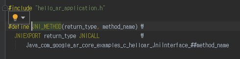 이 방법을 쓰면 훨씬 수월하게 C/C++ 함수 구현부를 만들 수 있겠네요. NDK로 되어 있는 어떤 샘플 코드를 확인 해 보니, 아래와 같이 전처리문을 정의 해 놓고 편리하게 쓰고 있네요. 즉, 함수 이름과 인자만 주면, 'Java'와 '패키지 네임', '클래스 네임'을 합쳐서 함수명을 만들어 주도록 했네요.