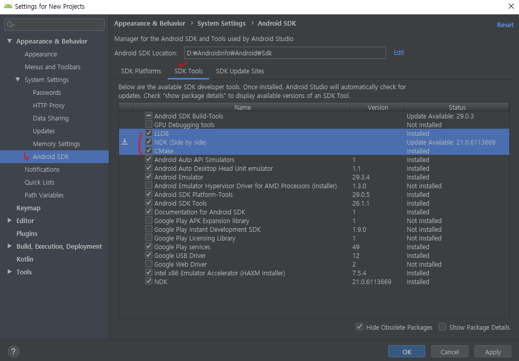 프로젝트 세팅 창에서 아래 그림과 같이 필요한 툴을 설치/업데이트 합니다.