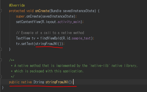 activity code를 살펴보면, text view에 글자를 할당하는 부분에서 JNI로부터 문자열을 가져오는 함수가 있습니다.