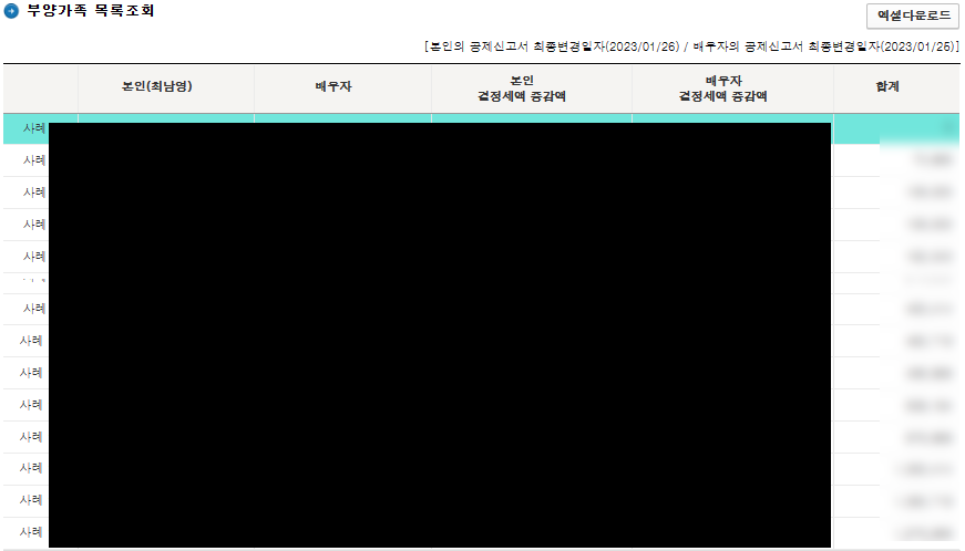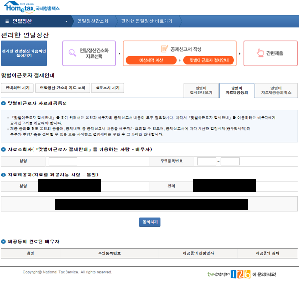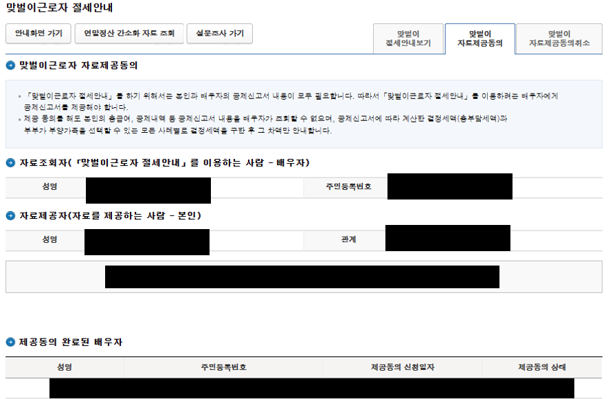 그렇게 해서, 자료 제공 동의가 되면, 가장 아래쪽에 제공 동의가 된 배우자가 표시 됩니다.