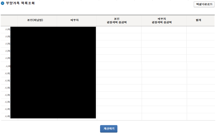 먼저, 부양가족의 가능한 조합이 쭉 나타납니다. 그 상태에서, 계산하기를 누릅니다.