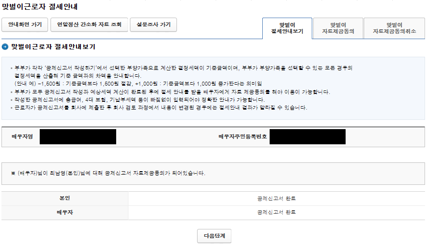그러면, 해당 배우자와 상호 자료 제공 동의 상태를 다시 한번 더 보여줍니다. 다음 단계로 넘어갑니다.