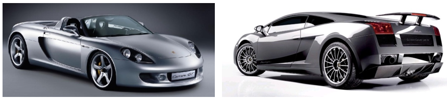 시점의 위치가 반사광에서 얼마나 가까운가가 밝기에 영향을 주는 것을 알 수 있습니다. 앞에서 말한 자동차의 경우를 아래 그림을 참고해서 다시 상상 해 봅시다. 둘 다 멋진 차는 맞는데, 오른쪽이 좀 더 광택이 있어 보입니다. 이 "광택이 있다."는 표현이 나타내는 것은 하이라이트인 부분이 매우 밝고 그 경계가 선명한 경우 사용된다고 볼 수 있습니다.