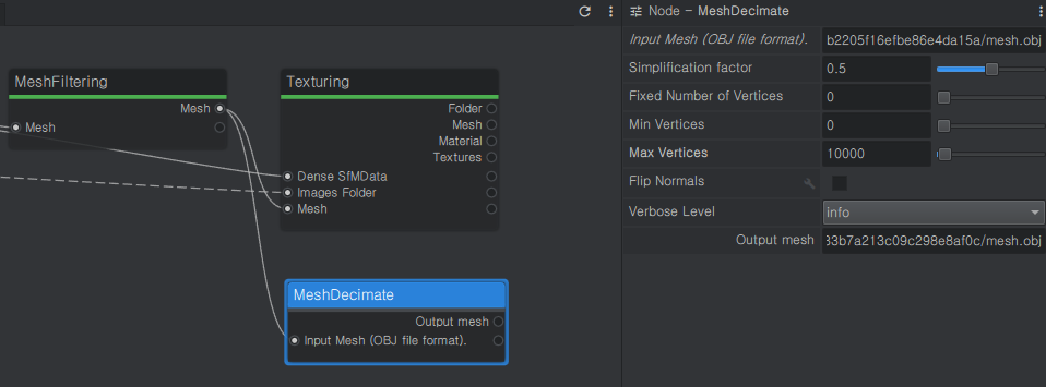추가 된 MeshDecimate 노드의 입력에 MeshFiltering 노드의 출력 Mesh를 연결 해 줍니다. 그리고, Decimate 노드의 최대 Vertex 개수를 10000fh 설정했습니다.