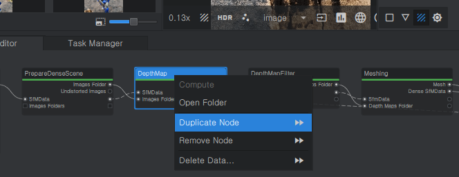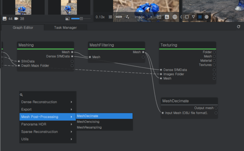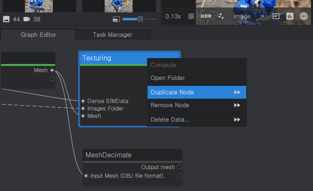 진행 중인 Decimate는 오렌지색, 대기 중인 Texturing2는 하늘색으로 표시 됩니다. 복제 된 노드의 이름을 정할 수 있으면 편리 할 것 같은데 그런 방법은 없는 것 같고, 노드 종류별로 뒤에 숫자가 증가하면서 구분 되는 것 같습니다.