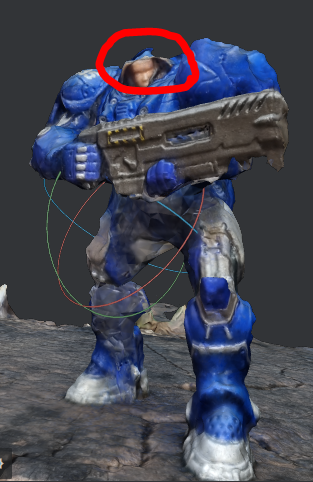 조금 꼼꼼하게 살펴 봤더니, 형상이 좀 좋지 않은 곳도 보였습니다. 카메라에 잘 잡히지 않았던 부분이거나 검은색이라서 Feature가 없었던 부분 아닌가 싶은데요, 무릅쪽에 구멍이 나 있었습니다.