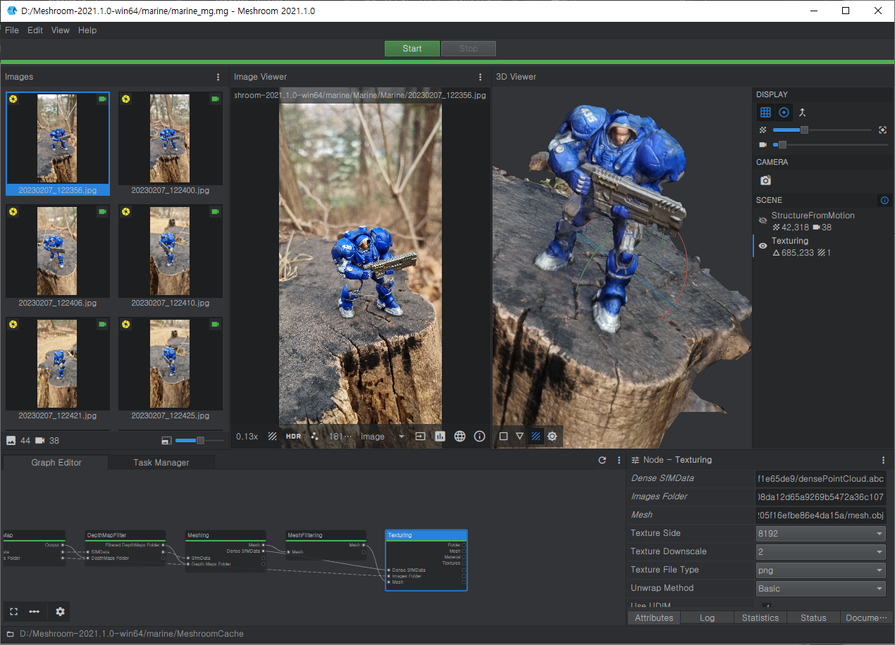 meshroom을 이용하여 샘플 사진으로부터 3D 오브젝트를 생성하는 과정을 살펴보았습니다.
