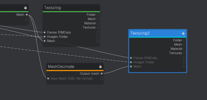 그 다음은 Decimate가 된 새 mesh에 다시 Texturing을 하기 위해, 기존에 있던 Texturing node를 복제합니다.