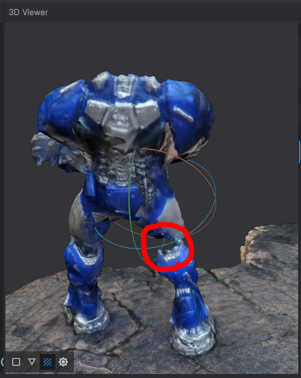 조금 꼼꼼하게 살펴 봤더니, 형상이 좀 좋지 않은 곳도 보였습니다. 카메라에 잘 잡히지 않았던 부분이거나 검은색이라서 Feature가 없었던 부분 아닌가 싶은데요, 무릅쪽에 구멍이 나 있었습니다.