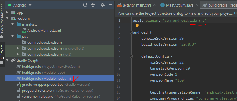build.gradle(Module: ressum)을 열어보면 apply.... 끝에 library라고 되어 있어요.
