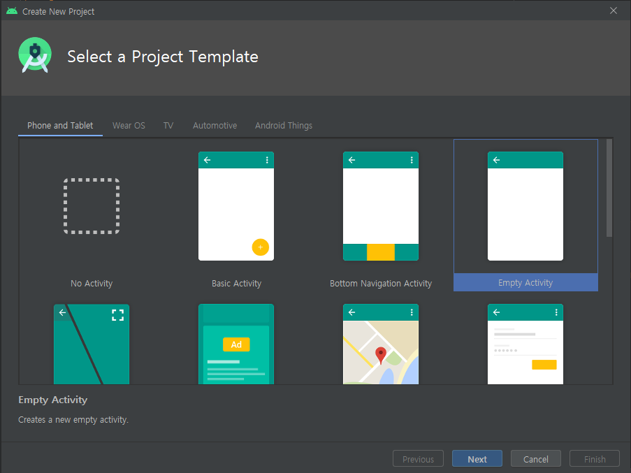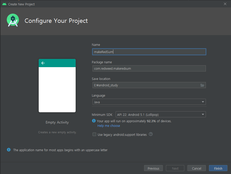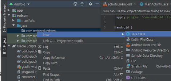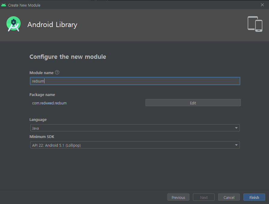 - visual studio도 그랬었고, android studio도 library용 프로젝트 템플릿이 따로 있었던 것 같은데 잘 안보이네. 그럴 땐 일반 빈 프로젝트로...