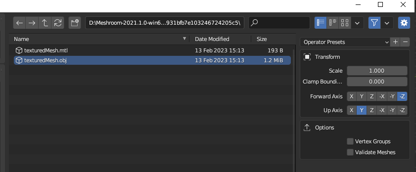 파일을 열었더니 원점과는 좀 거리가 있는 곳에서 만들어졌네요. 그리고 위아래 방향도 기대와 다르고... meshroom에서 내보내기 전에 좌표축을 설정 해 주는 과정은 기억나지 않는데, 데이터 처리 과정의 어느 단계에서 어느 작업을 하는 것이 가장 좋은지는 한번 검토 해 보는 것이 좋을 것 같네요 실제로 이 과정으로 뭔가 해야 할 경우라면 말이죠~