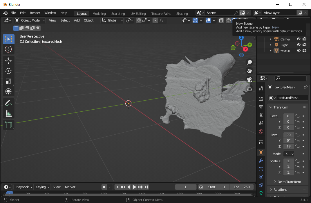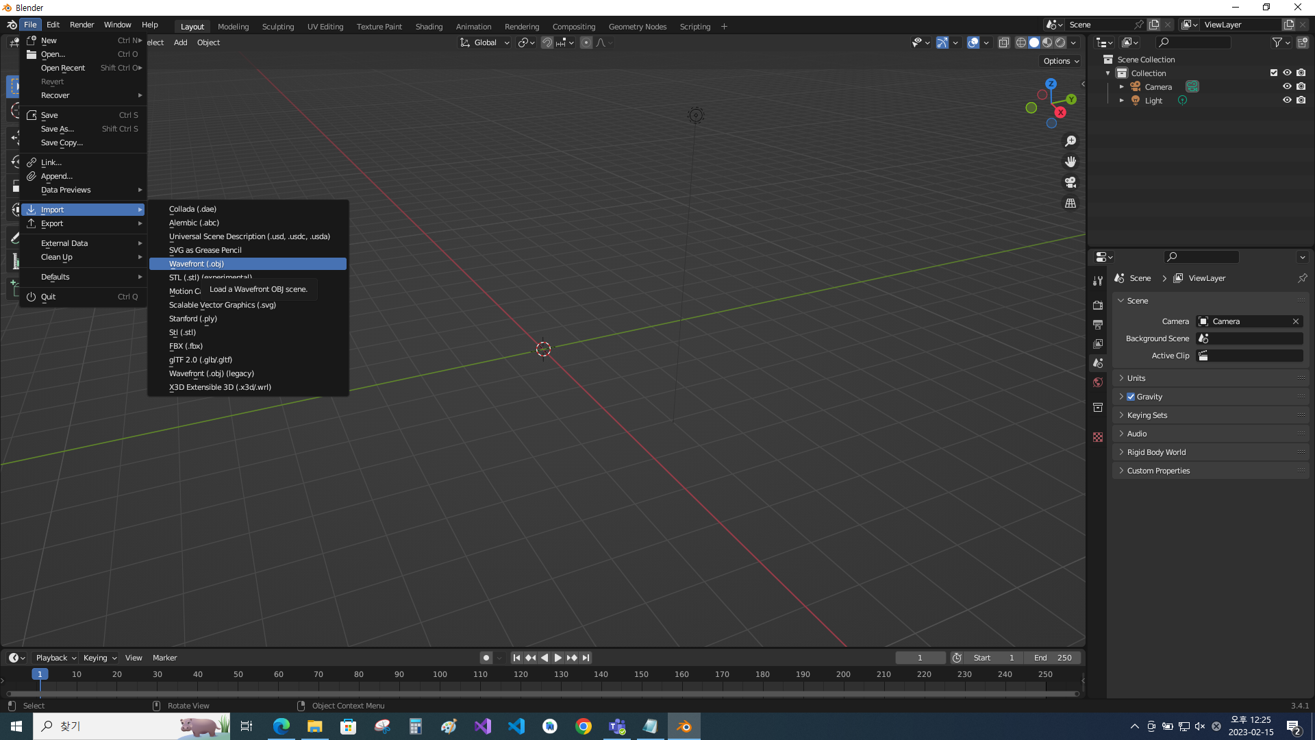 Blender로 새 프로젝트를 만들고, 기본적으로 생성되어 있던 Cube를 삭제한 후, File > Import > Wavefront OBJ를 선택하여 meshroom에서 만든 데이터를 불러들이도록 합니다.