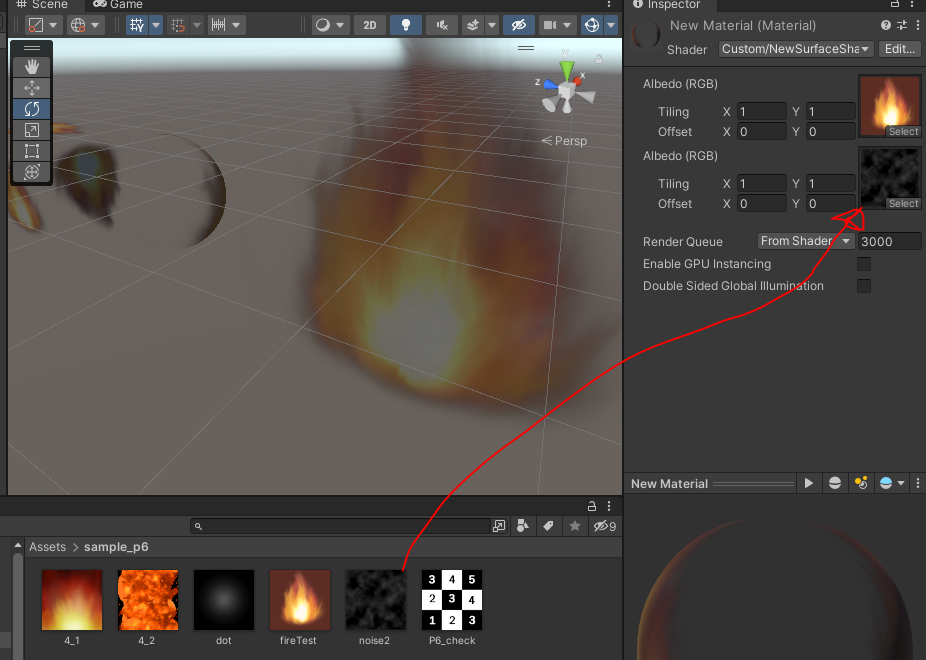 우선 텍스쳐를 이미지로 사용하는 사례로써, 두 개의 이미지를 이용하여 불꽃 효과를 표현하는 것을 살펴 보겠습니다.