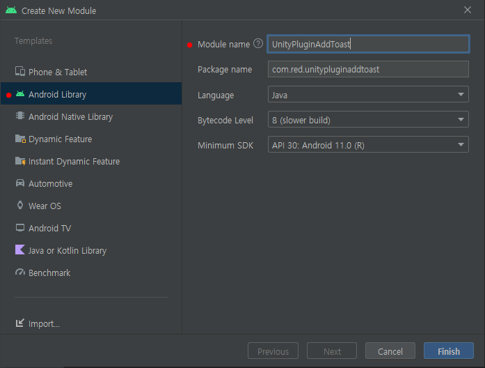AAR 설정창에서 Package name은 나중에 Unity에서 불러올 때 사용하는 것이니 잘 작성 해 줍니다.