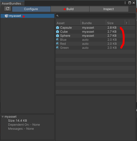 이제는 처음에 추가한 Asset Bundle Browser를 실행하면, 등록 된 Asset Bundle 목록이 좌측에 나타나며, 선택을 하면 거기 포함 된 오브젝트들과 그 오브젝트가 사용하는 다른 에셋(이 예의 경우, material)도 자동으로 포함 된 목록이 오른쪽에 나타납니다. 이상이 없으면 빌드를 누릅니다.