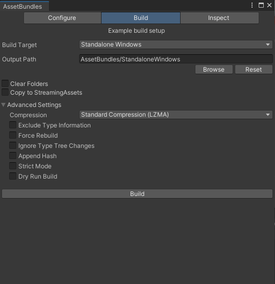 매뉴얼 내용을 보면 Asset Bundle을 빌드하기 위해 매뉴를 추가하고 빌드를 실행하는 스크립트를 작성하는 내용이 있습니다. 그러나, Asset Bundle Browser라는 툴을 설치하면 GUI를 통해서 편리하게 할 수 있습니다. 예전에는 이것도 따로 설치를 해줘야했으나, 이제는 Unity의 Package Manager를 통해서 쉽게 설치 할 수 있고, 이 내용도 매뉴얼에 포함되어 있습니다.