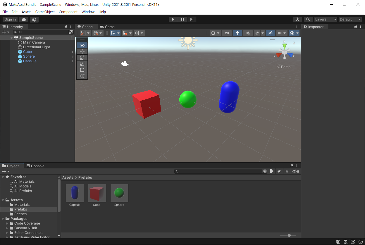 꼭 그래야 하는 것은 아니지만, Asset Bundle이 로딩되어 사용 될 상태의 프로젝트에서, 해당 Asset들이 제대로 사용되는 것을 확인하고, 그 대상들을 모아서 Asset Bundle을 만들어 주도록 하겠습니다. 예로써, 그냥 빈 공간에 바닥을 하나 만들고, 빨강/노랑/파랑의 육면체/구/캡슐 형상을 만들어 줍니다. 이 세개를 Prefab으로 만들고 이것들을 Asset Bundle이 될 오브젝트라고 가정하겠습니다.