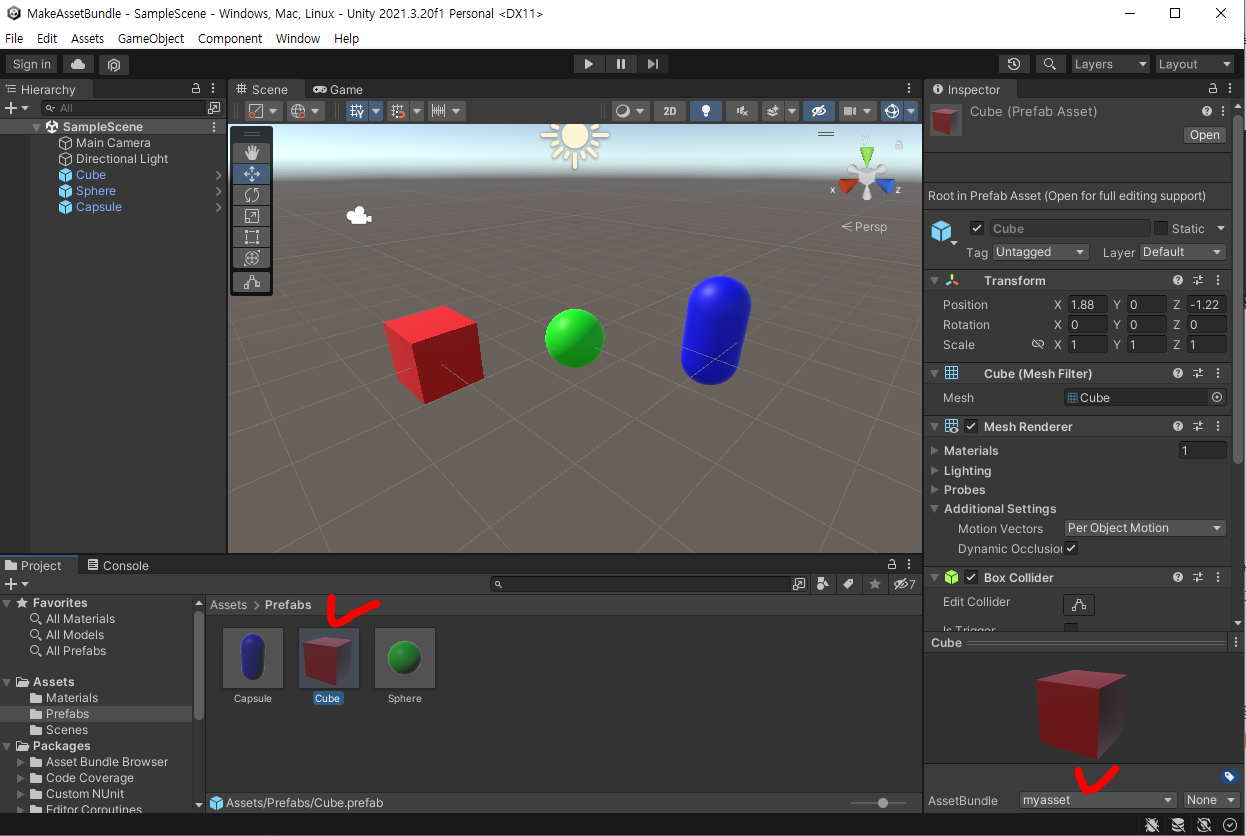 먼저 할 일은 Asset Bundle로 묶을 오브젝트들에게 Asset Bundle 이름을 부여하는 것입니다.