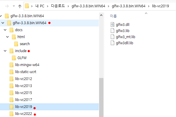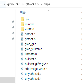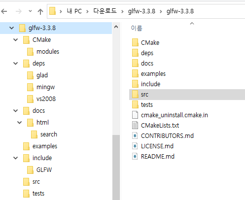 GLFW를 받아서 직접 빌드해서 쓰는 경우, 아래와 같은 소스 코드를 받게 됩니다.