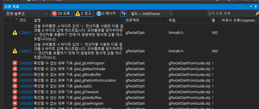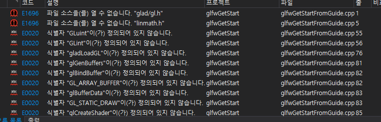 헤더파일이 없다는 오류는 사라졌지만 glad_XXXX 형식의 함수를 찾을 수 없다는 에러가 뜹니다. 이것은 glad_XXX라는 함수가 정의 된 lib가 필요한데, 우리는 glfw를 설치했지 glad는 만들지 않았어요. 즉, 이 샘플 코드는 소스 코드로부터 직접 만들어서 쓰는 경우에 적합한 샘플인 것 같아요.