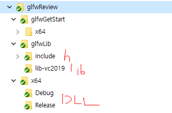 프로젝트 폴더 구조는 아래와 같이 구성 해 봤습니다. glfwLib 폴더를 만들어, 다운로드 받은 prebuilt binary를 넣어두었고, DLL을 위의 Hello, world를 실행 시킨 결과로 만들어지는 exe가 들어있는 폴더에 넣어둡니다. DLL을 시스템 폴더에 넣어두는 것은 좀 아닌 것 같아서~