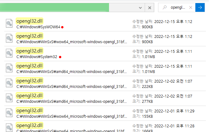검색을 해 보면, 여러 개의 opengl32.lib가 검색 되는데, 이것은 freeglut 기반 환경 설정의 내용과 동일합니다. 즉, system32 폴더 내의 opengl32.dll이 사용 되는 것이죠. WOW64가 64비트용 같은데 아니라는 것은 freegult 환경 설정에서도 이야기 했었죠? (했었나???..)