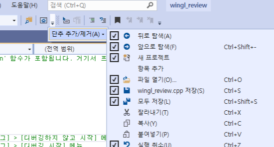 가장 아래쪽 사용자 지정을 눌러 '디버깅하지 않고 시작' 버튼을 디버깅 시작 옆에 추가 합니다.