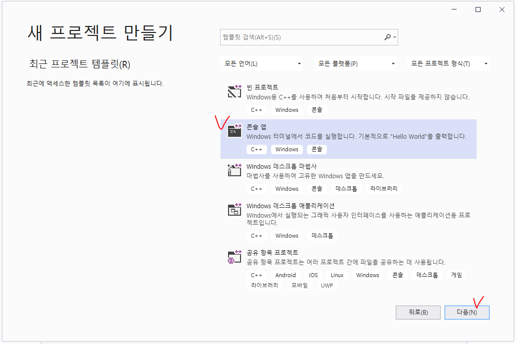 'C++을 사용한 테스크톱 개발'만 선택하고 기본 옵션 그대로 유지합니다.