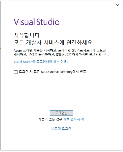 설치가 다 되고 실행되면 로그인 창이 뜨는데, 귀찮지 않으시면 가입해서 로그인 하는게 좋아요. 돈 드는 거 아니니까... github도 MS에서 인수해서 같은 계정 쓰시면 되고.
